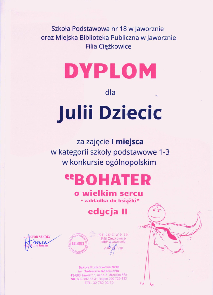 Julia Dziedzic z klasy III a zajęła I miejsce w ogólnopolskim konkursie plastycznym „Bohater o wielkim sercu – zakładka do książki” edycja II. Konkurs był organizowany w ramach akcji „Czytamy z sercem”, którą koordynowała biblioteka szkolna. Organizatorami konkursu były: Szkoła Podstawowa nr 18 im. Tadeusza Kościuszki w Jaworznie oraz Miejska Biblioteka Publiczna w Jaworznie – filia Ciężkowice. Partnerem konkursu i fundatorem nagród było Wydawnictwo Dwukropek.