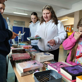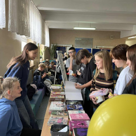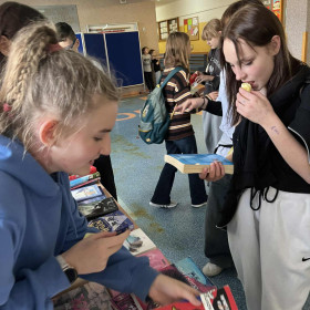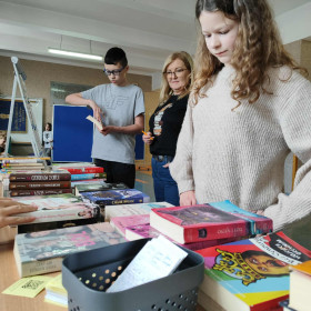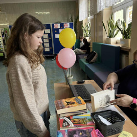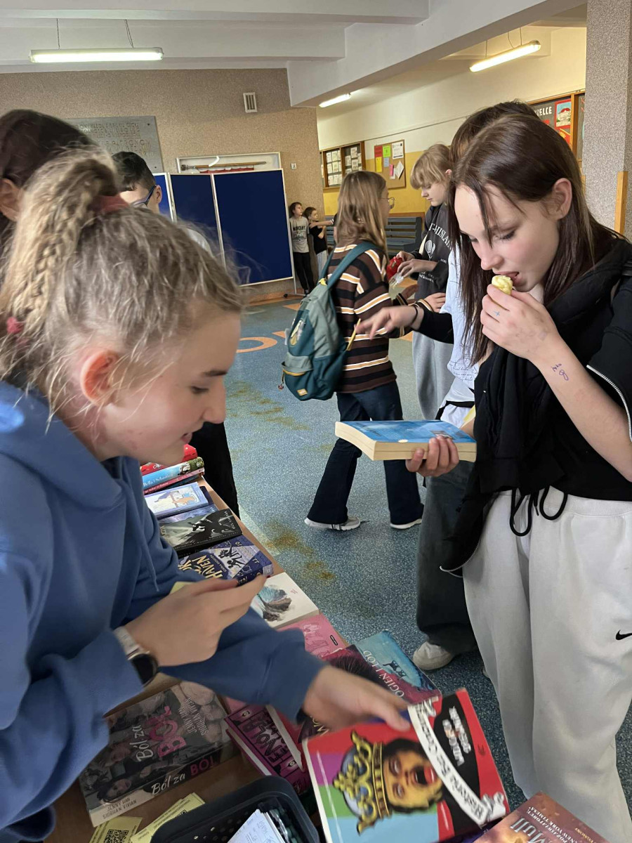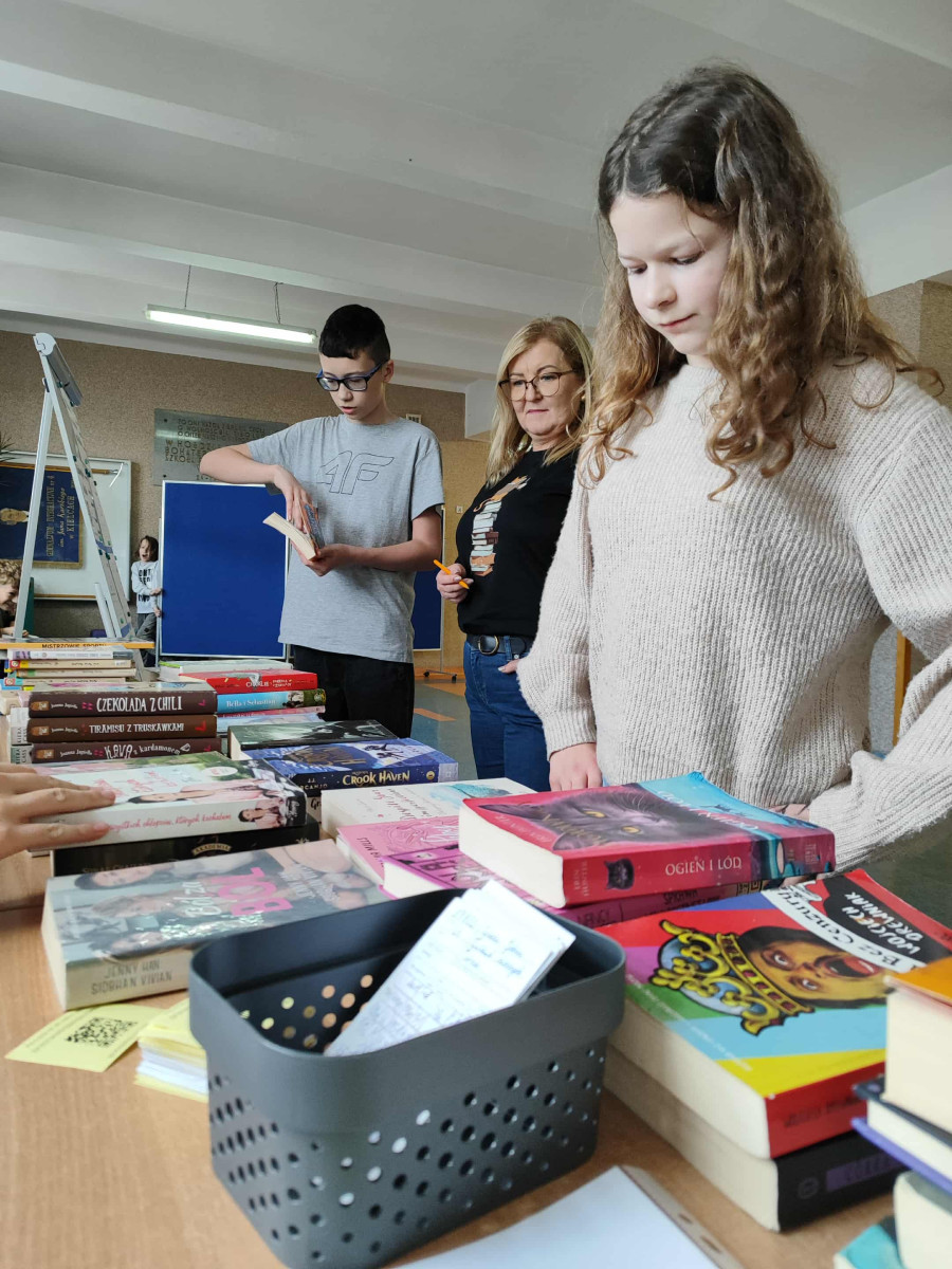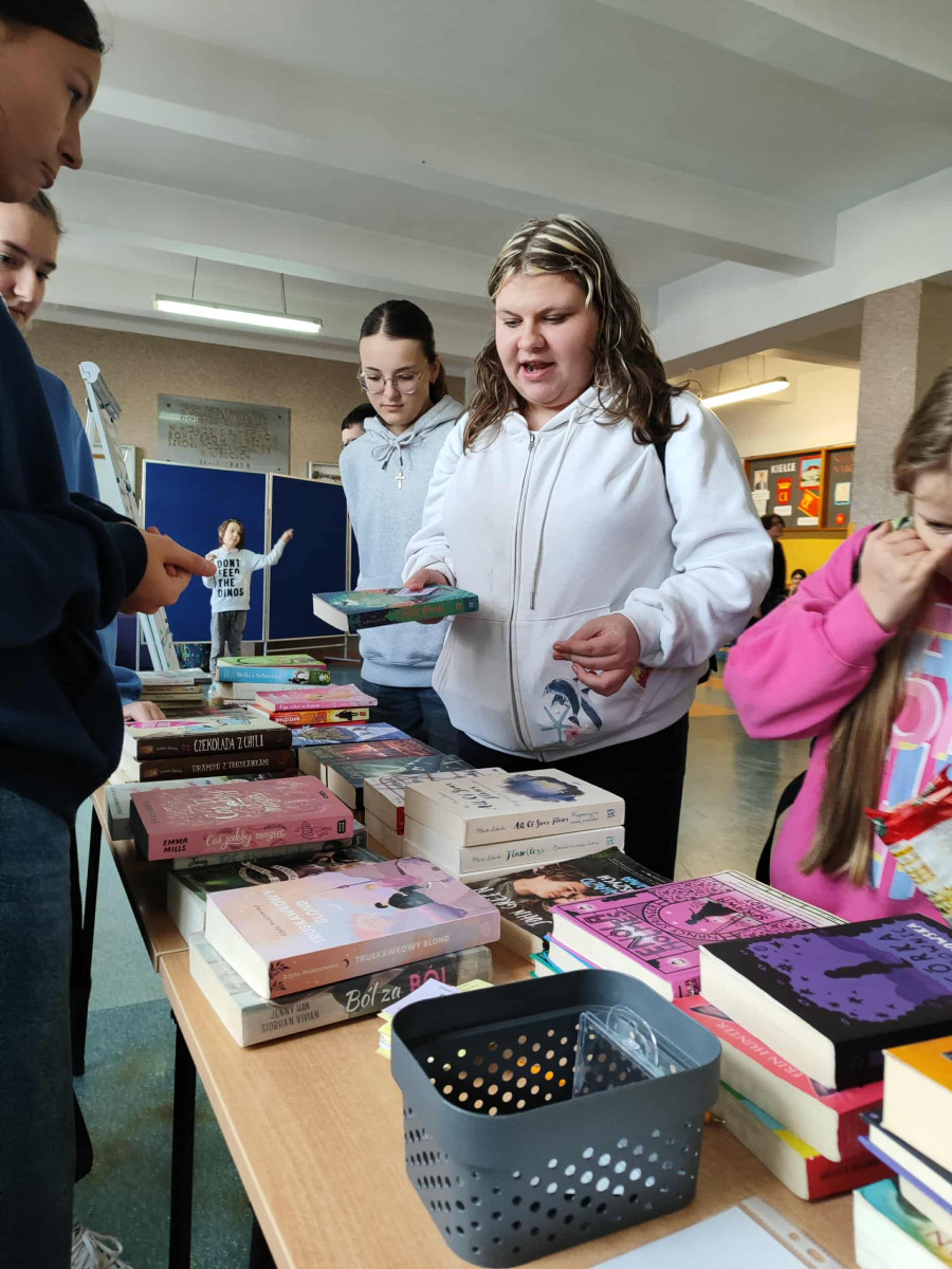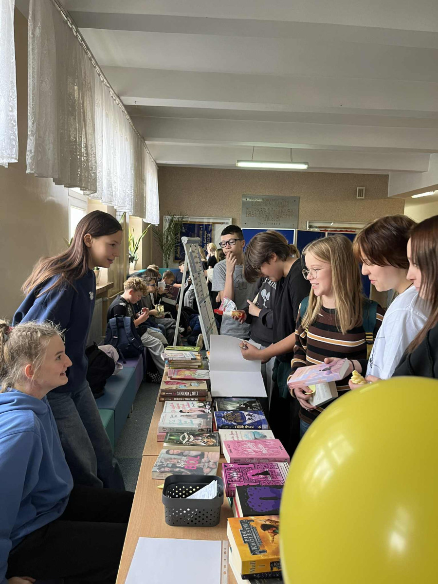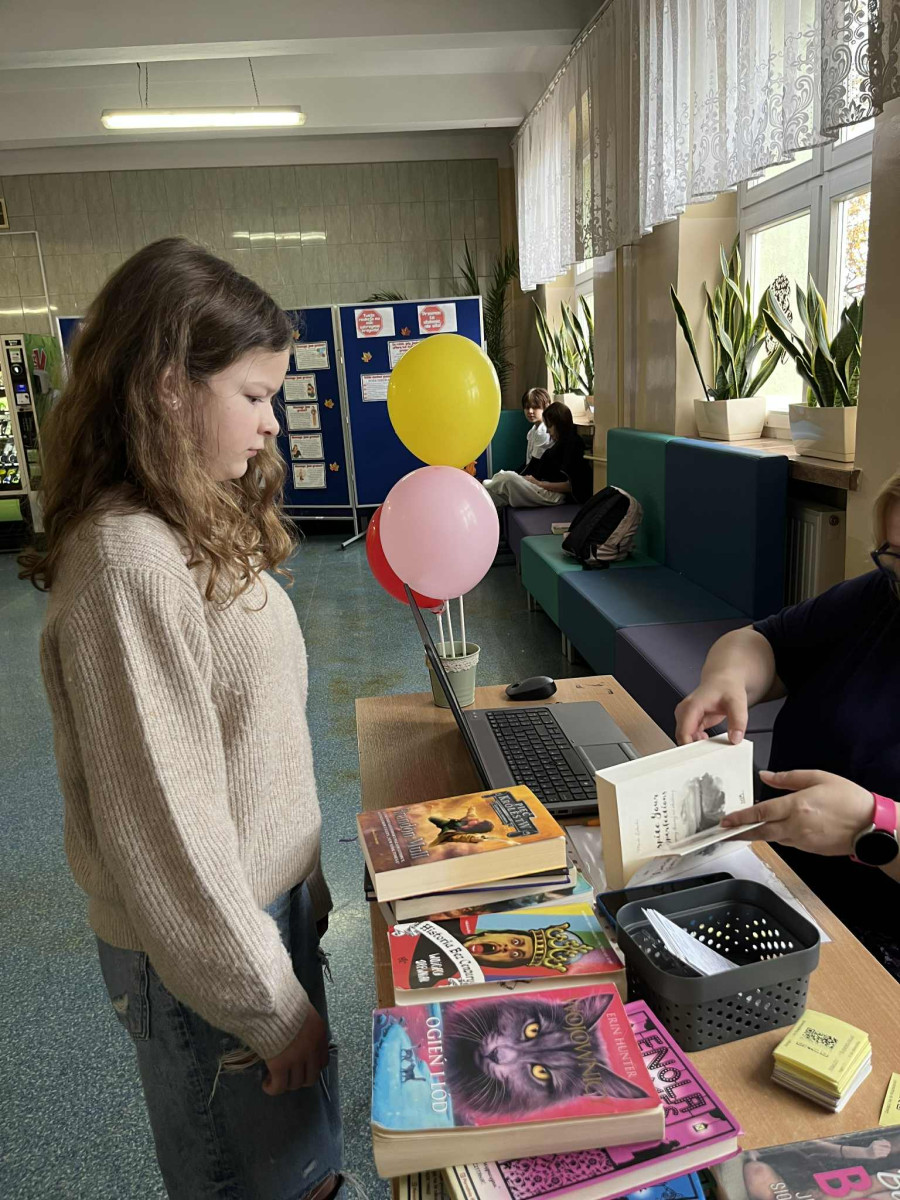 W dniu 30 października 2025 r. uczniowie wypożyczali książki dostępne w bibliotece na głównym holu szkoły.