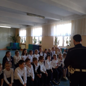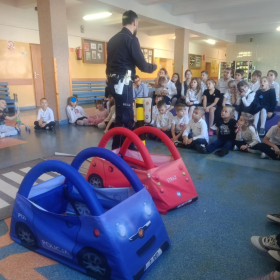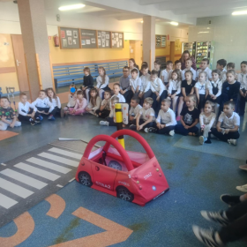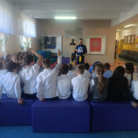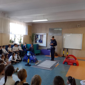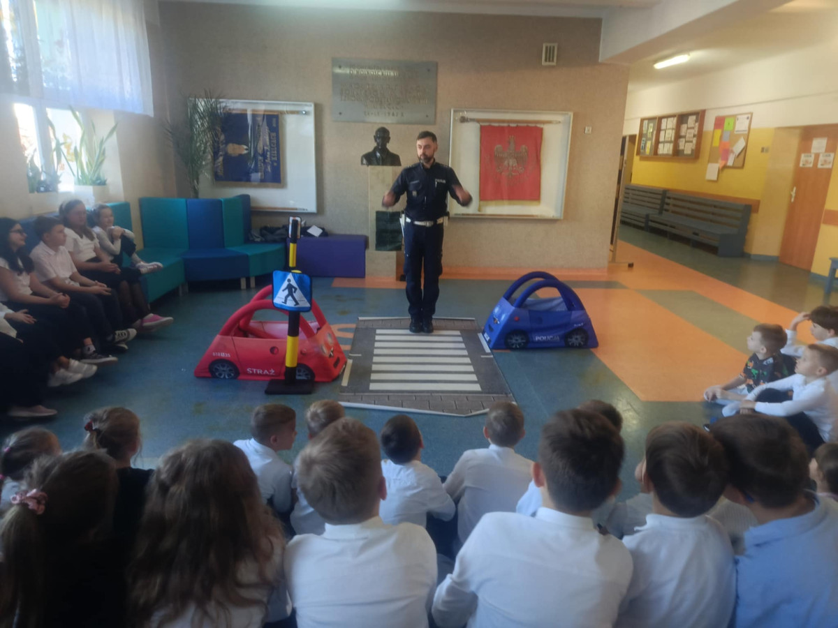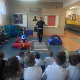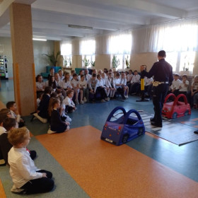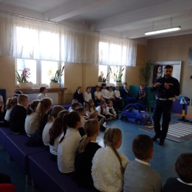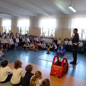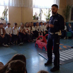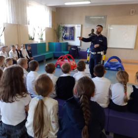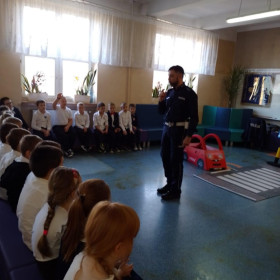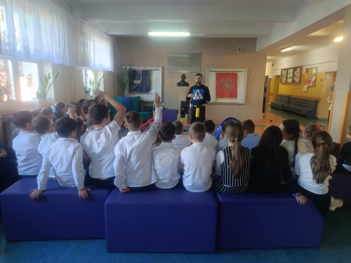 Prowadzący spotkanie zwracał uwagę, jakie reguły bezpieczeństwa należy zachować w ruchu drogowym. Policjant utrwalał dzieciom zasady poruszania się po ulicy, chodniku oraz podczas jazdy rowerem. Najmłodsi uczniowie nabywali umiejętności radzenia sobie w sytuacjach zagrażających bezpieczeństwu, na przykład zachowaniu rozwagi i ostrożności w kontaktach z nieznajomymi oraz prawidłowego używania numerów alarmowych. Ponadto policjant przypominał uczniom, iż stosując elementy odblaskowe zwiększają bezpieczeństwo własne oraz innych uczestników dróg. Wszyscy uczniowie czynnie uczestniczyli w spotkaniu, dzielili się swoimi spostrzeżeniami i doświadczeniami oraz zadawali bardzo dużo pytań. Takie spotkania profilaktyczno – edukacyjne odbywają się w naszej szkole od wielu lat i motywują dzieci do świadomego i bezpiecznego zachowania.