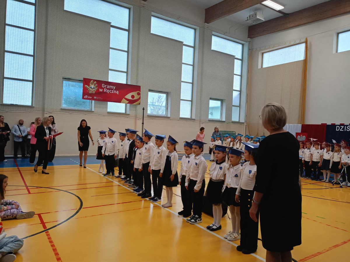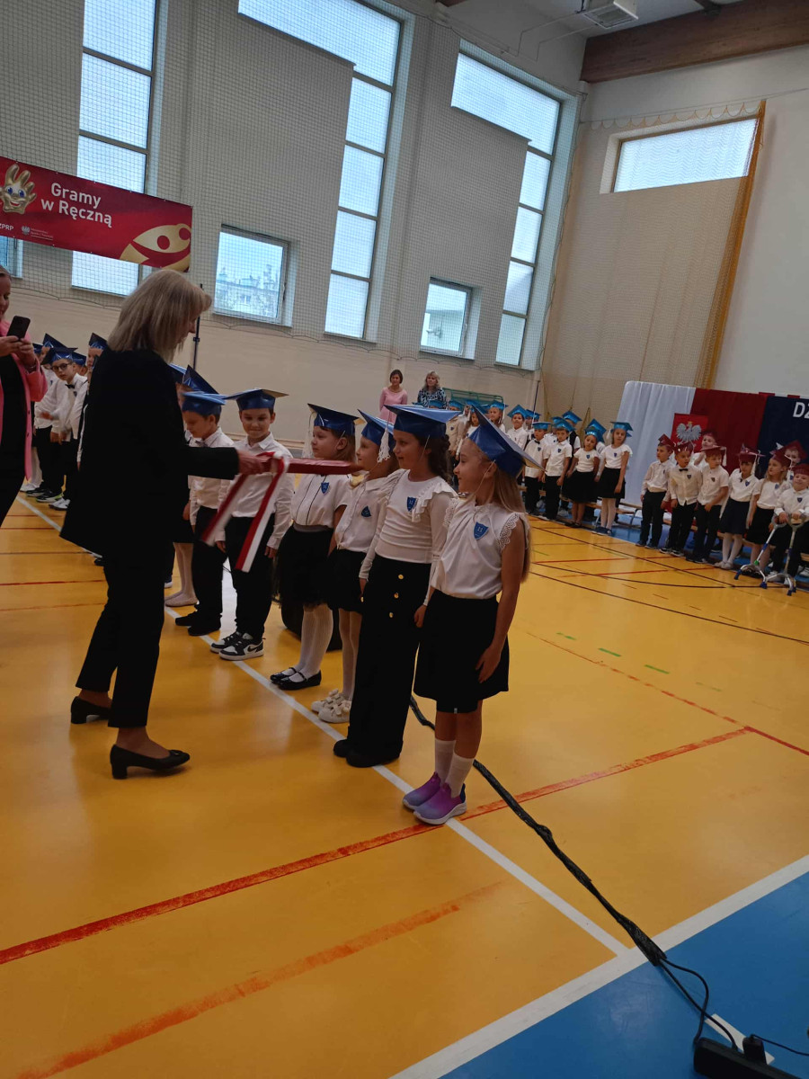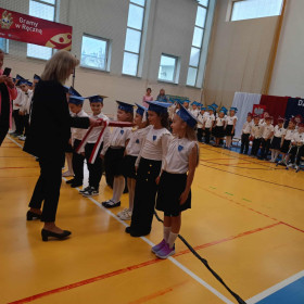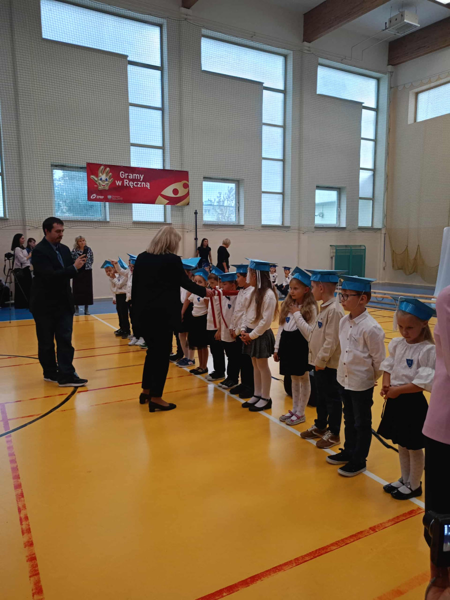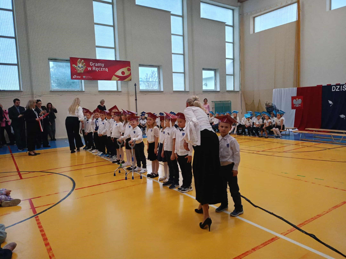 Doniosłym momentem uroczystości było pasowanie na uczniów przez panią Dyrektor Elżbietę Siudak. Ten symboliczny gest przypieczętował rozpoczęcie nowego etapu w życiu szkolnym naszych pierwszaków.