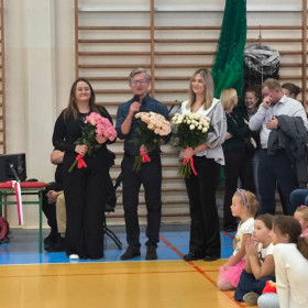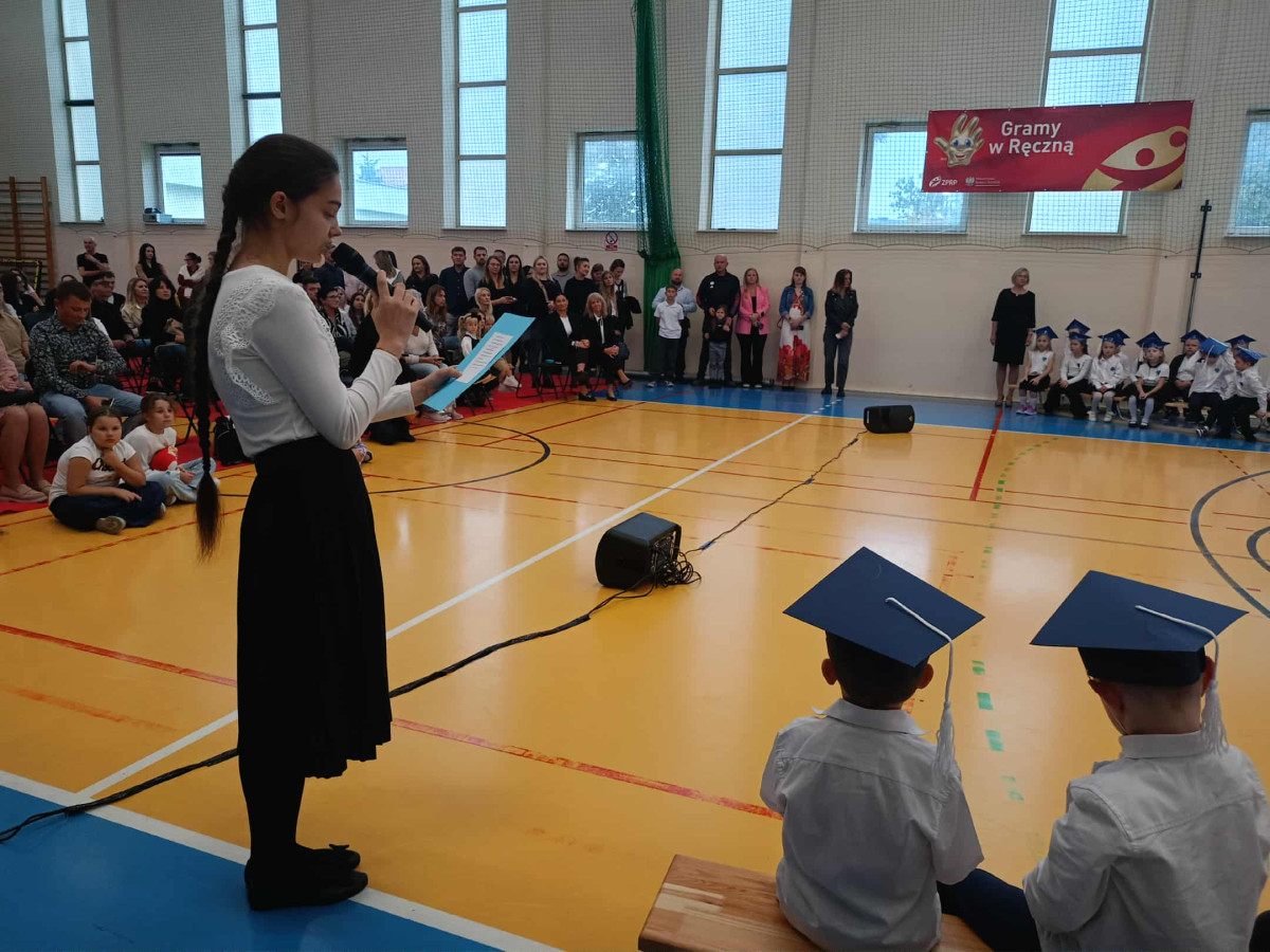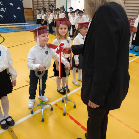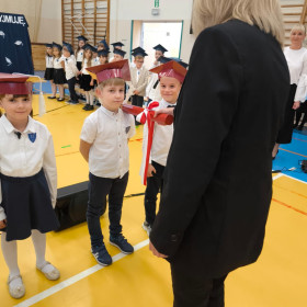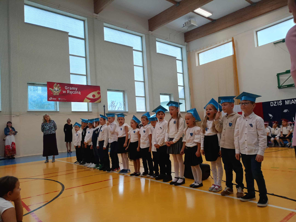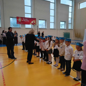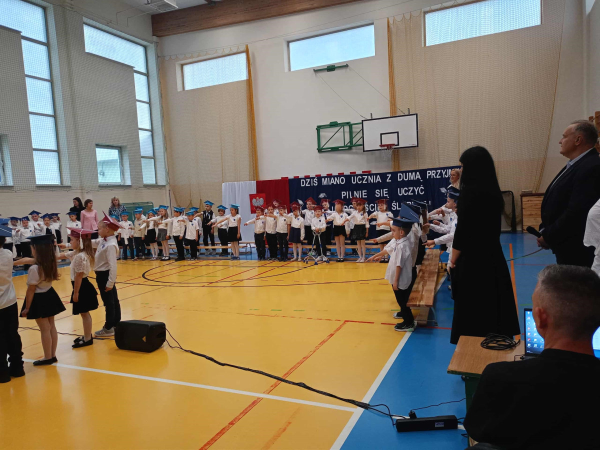 Doniosłym momentem uroczystości było pasowanie na uczniów przez panią Dyrektor Elżbietę Siudak. Ten symboliczny gest przypieczętował rozpoczęcie nowego etapu w życiu szkolnym naszych pierwszaków.