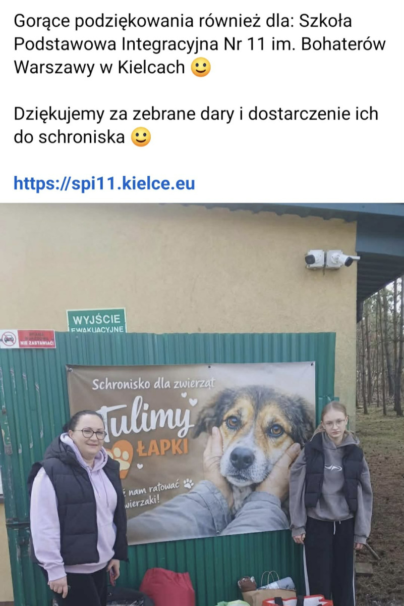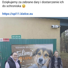 Klasa 5 d przeprowadziła zbiórkę karmy i niezbędnych akcesoriów dla zwierząt schroniska ,, Tulimy łapki,, w Suchedniowie. Do schroniska przekazano mokrą i suchą karmę, przysmaki, miski, smycze i zabawki dla pupili. Cieszymy się, że mogliśmy pomóc rodzice i uczniowie 5 d.