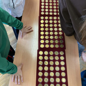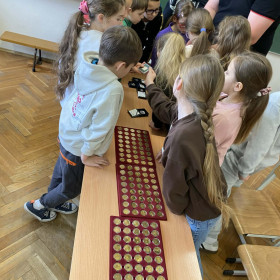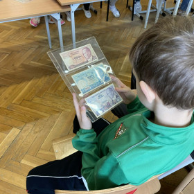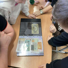 20.02.2026r. uczniowie klasy 2a uczestniczyli w ciekawej lekcji przeprowadzonej przez tatę naszego ucznia Macieja, pana Szymona M. Podczas, której uczniowie mieli okazję zobaczyć kolekcję gromadzonych przez wiele lat banknotów oraz monet w różnych walutach i z różnych okresów czasu. Pojawiły się również banknoty z okresu wojny. Uczniowie z wielką ciekawością i zainteresowaniem oglądali kolekcję i słuchali ciekawostek na jej temat.