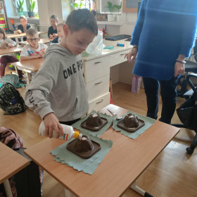 Uczniowie klasy I d uczestniczyli w wyjątkowych zajęciach prowadzonych przez zaproszonego specjalistę. Podczas spotkania dzieci obserwowały i samodzielnie wykonywały doświadczenia. Największe emocje wzbudził wybuch wulkanu. Uczniowie sprawdzali także, jak działa równowaga („ptaszek na palcu”), dlaczego rodzynki unoszą się w wodzie gazowanej, jak powietrze utrzymuje piłeczkę styropianową oraz czego potrzebują rośliny rosnące w słoiczku. Zajęcia były pełne radości i odkrywania, a nauka okazała się świetną zabawą.