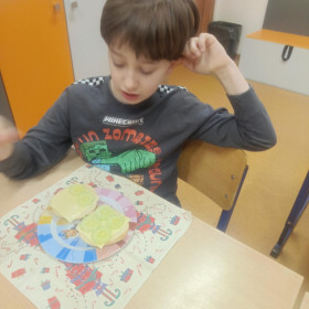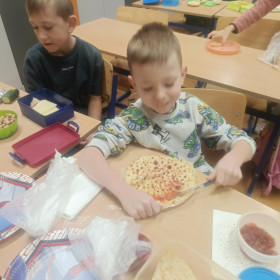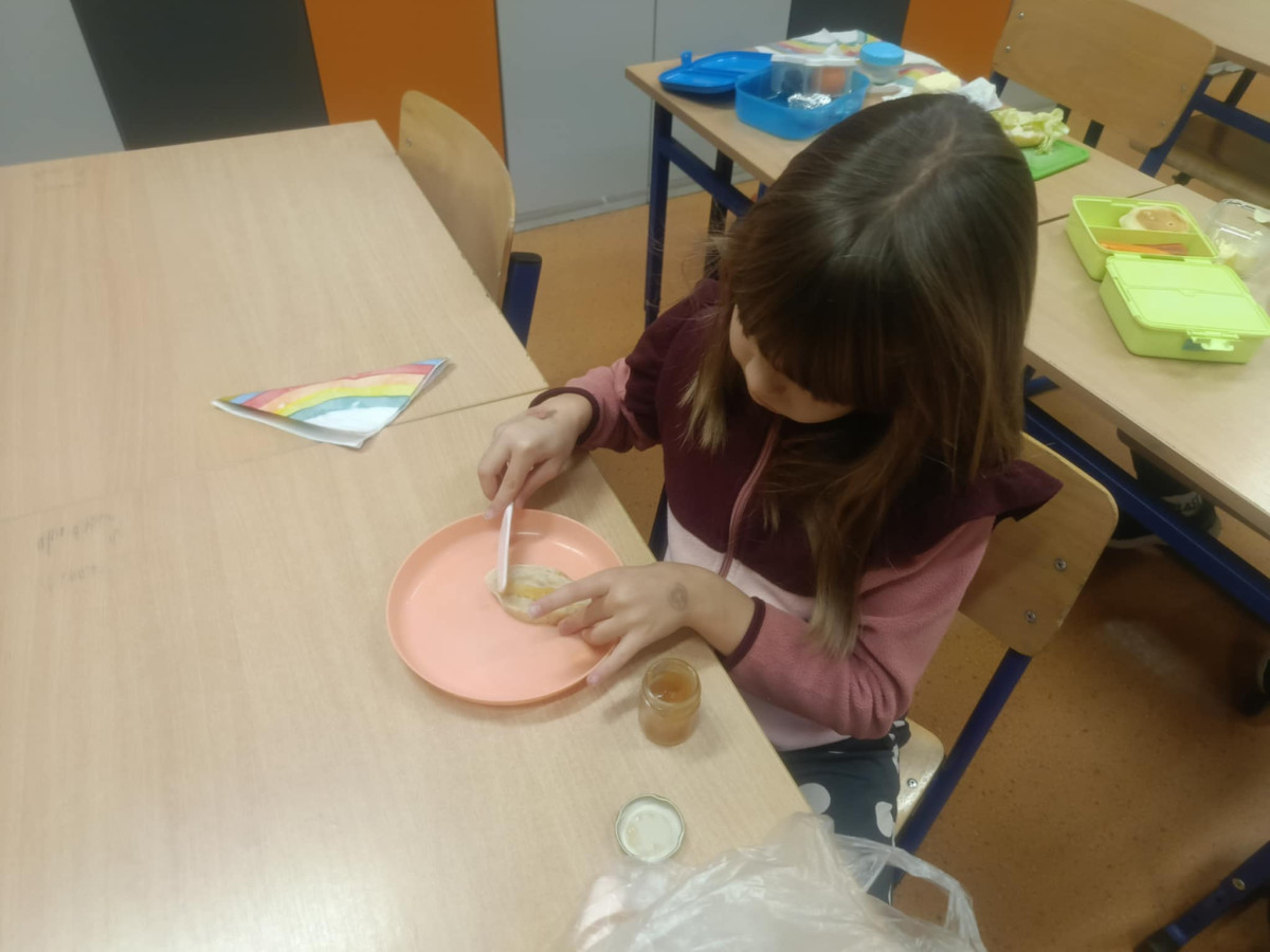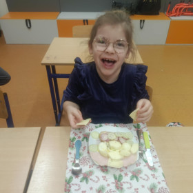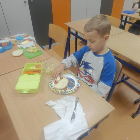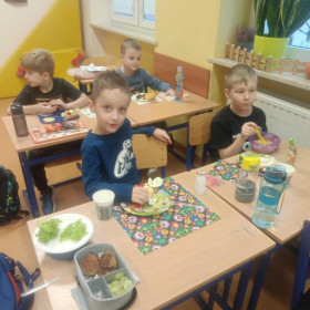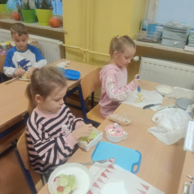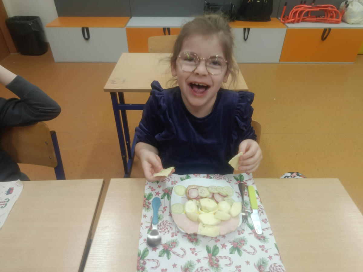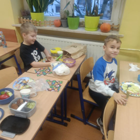 26 listopada 2025 r. uczniowie naszej klasy wzięli udział w wspólnym przygotowaniu zdrowego śniadania, którego celem było promowanie prawidłowych nawyków żywieniowych oraz dbania o swoje zdrowie. Dzieci samodzielnie komponowały kanapki i przekąski z wykorzystaniem świeżych warzyw, owoców oraz pełnowartościowych produktów. Wspólne przygotowanie posiłku dało uczniom nie tylko dużo radości, ale również pozwoliło utrwalić wiedzę o tym, jak ważne jest codzienne, wartościowe śniadanie.
