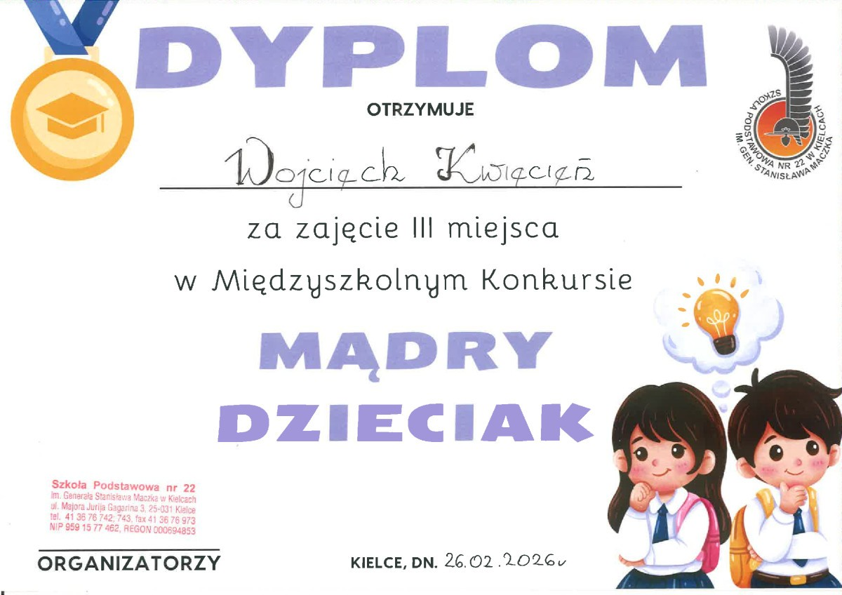 26 lutego 2026 roku w SP 22 w Kielcach odbył się XIX MIĘDZYSZKOLNY KONKURS WIEDZY DLA UCZNIÓW KLAS TRZECICH „MĄDRY DZIECIAK”.